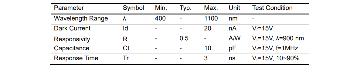 产品特色: ➢ Large Active diameter ➢ Small dark current ➢ High reliability 应用范围: ➢ Infrared Detec